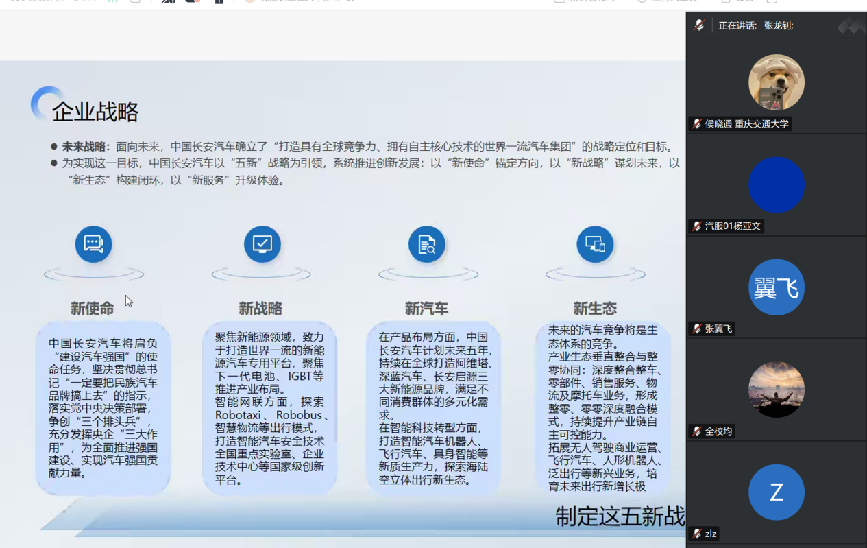 本次学术报告中,张龙钊工程师系统介绍了长安汽车的三次创业历程,重点阐释了其向世界一流汽车集团目标发展的“五新战略”与“三大计划”。他指出,长安汽车通过“香格里拉计划”(新能源)、“北斗天枢计划”(智能化)和“海纳百川计划”(全球化),构建了覆盖车辆研发、制造、服务的全生态体系,并强调“技术革命与用户需求变化是推动车企转型的核心动力”。