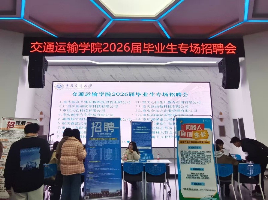 12月3日下午,交通运输学院2026届毕业生专场招聘会在南岸校区第一教学楼大数据中心顺利举办。本次专场招聘会汇聚了重庆臻焱节能环保科技股份有限公司和重庆睿蓝汽车科技有限公司等18家企事业单位,涵盖交通运输、交通工程、汽车服务和教育培训等多个行业。