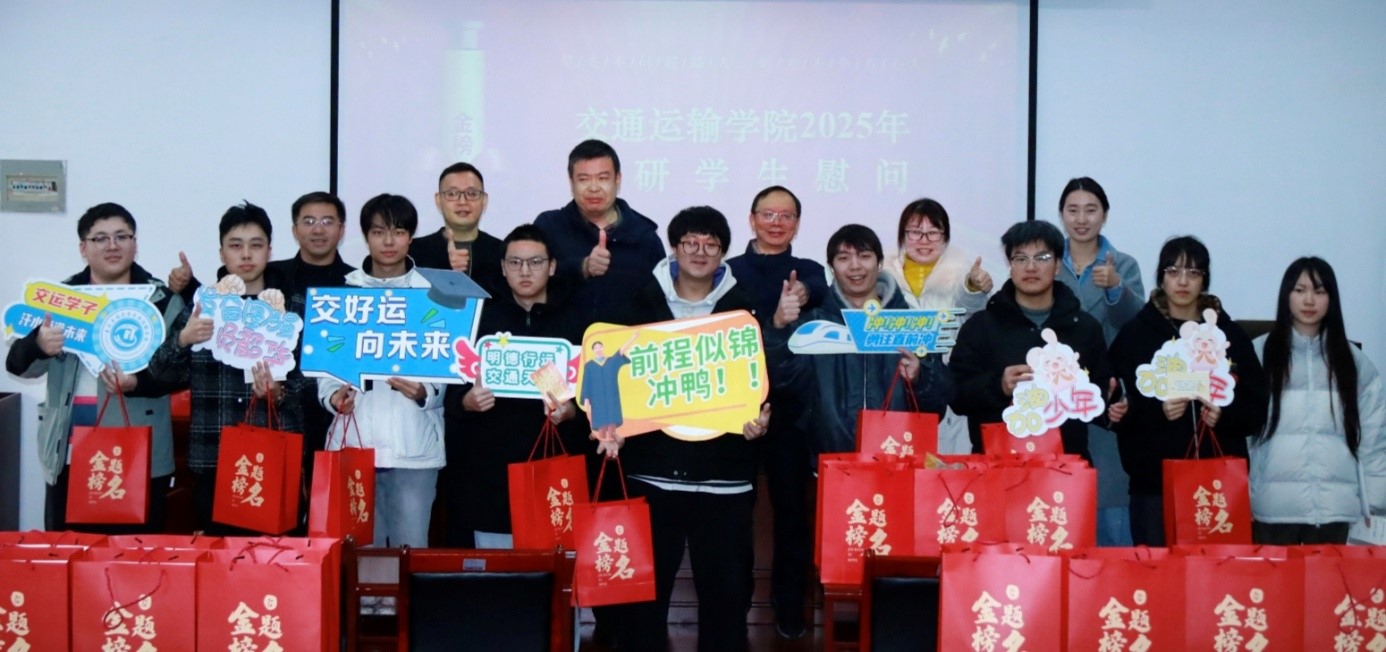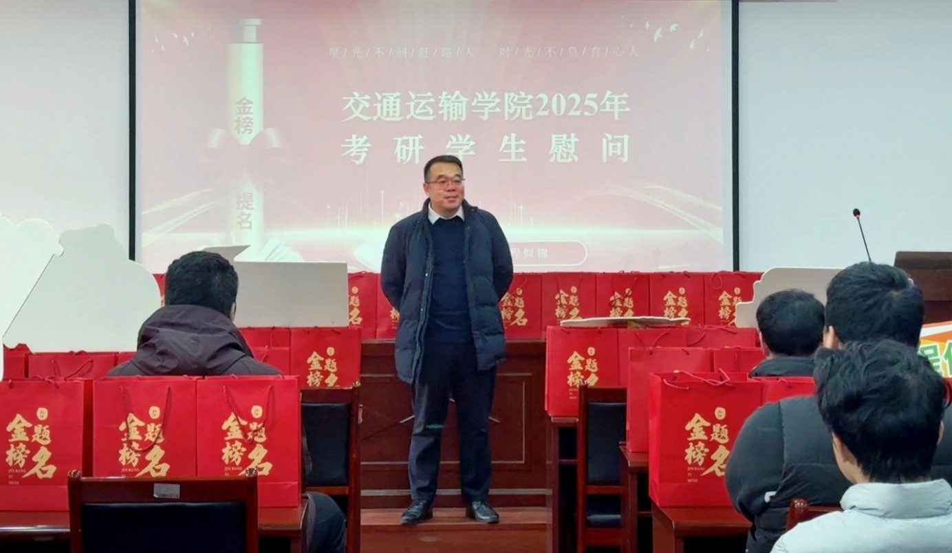 12月11日,在2026年全国硕士研究生招生考试来临之际,为助力考研学子筑牢信心、勇毅前行,交通运输学院在学院301会议室组织考研慰问活动。学院党委书记魏铜铃、院长刘唐志、党委副书记张韩笑以及蔡志鹏、刘楠楠、王嵩、刘爽四位老师来到现场一起为考研学子发放慰问礼包,并送上暖心关怀与真挚祝福。