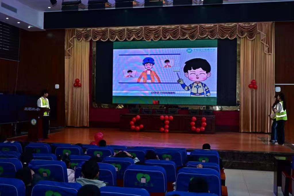 “同学们,街上走,下水井盖不要踩……”屏幕上的AI数字志愿者带领同学们拍手跟读交通安全顺口溜,稚嫩的童声在教室内回荡。终极挑战环节“雷雨天气怎么办”则通过现场表演、情景还原的方式,引导同学们思考恶劣天气下的避险举措。整场活动摒弃单向灌输,以闯关模式贯穿始终,同学们在欢声笑语中完成了“拍手跟读-动作模仿-情景演绎”的三阶强化学习过程。活动在热闹的氛围中接近尾声。40名学生被授予“交通安全小卫士”称号,大家齐声高喊“我是安全小卫士,文明出行我先行”的口号,定格下充满仪式感的瞬间。
